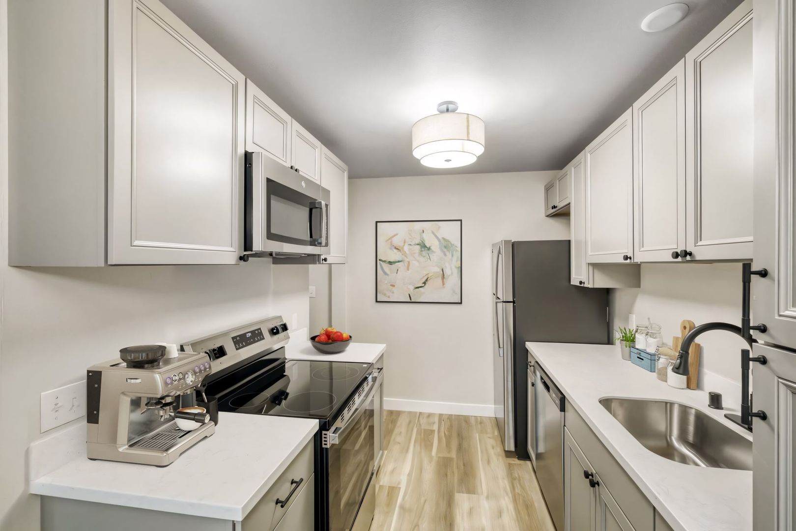 Safety and convenience are paramount, with completely upgraded electrical systems. The bathrooms and kitchen have been fully transformed, featuring new bathtubs, vanities, cabinets, and modern hardware. The kitchen boasts sleek stainless steel appliances and a built-in microwave, making it a chef’s delight.